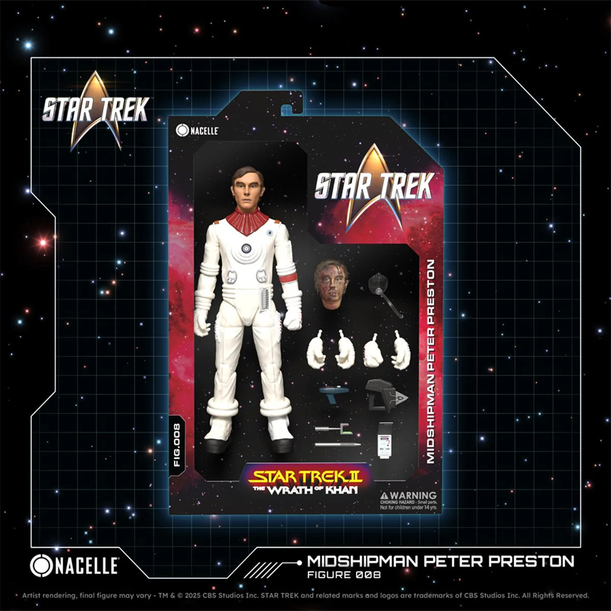 The Star Trek II communicator connects him to the rest of the crew during the crisis, and the oxygen mask—which connects directly to the suit—is a poignant reminder of the desperate measures taken during the engineering section disaster. This attention to both the character’s professional duties and his tragic fate shows Nacelle Company’s deep appreciation for Star Trek II and for the supporting characters who made the film’s emotional impact so powerful. Whether you’re a longtime Star Trek collector building your Enterprise crew, a fan of The Wrath of Khan’s unforgettable story, or simply appreciate characters whose courage and sacrifice remind us what Starfleet truly stands for, this Peter Preston figure deserves a place in your collection.